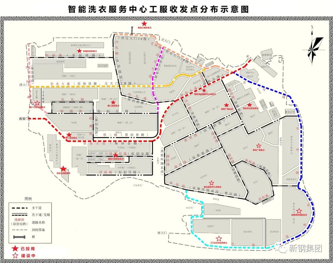 为确保广大职工都能享受智能洗衣服务,公司在厂区设置智能洗衣服务中心、炼铁厂、烧结作业区、焦化厂、钢一区、钢二区、第四行政区、第二行政区、焦化集控中心、机制公司、新钢新材、机电修造园、综合料场、实业公司等14个工服收发点,目前首批共投用9个。