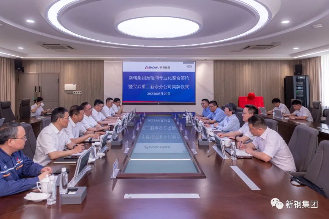6月29日,新钢集团磨辊间专业化整合签约暨宝武重工新余分公司揭牌仪式在新钢举行。新钢集团领导刘建荣、卢梅林、傅曙光、总经理助理向学庆,宝武重工领导胡玉良、程建国出席签约揭牌仪式。