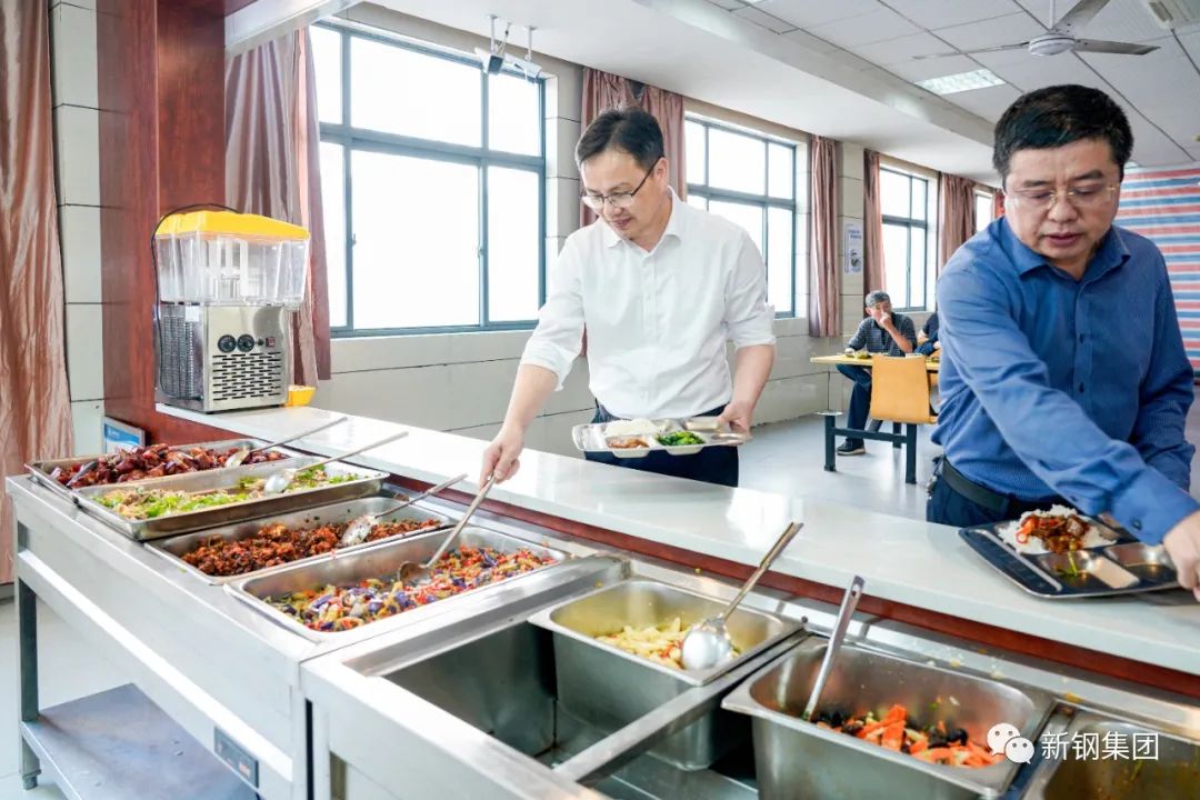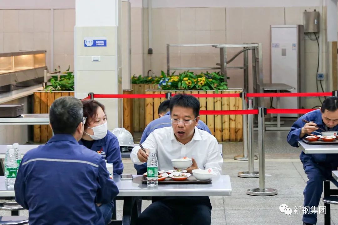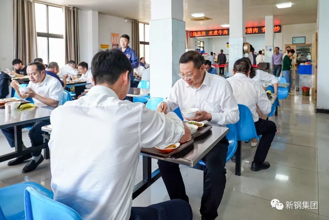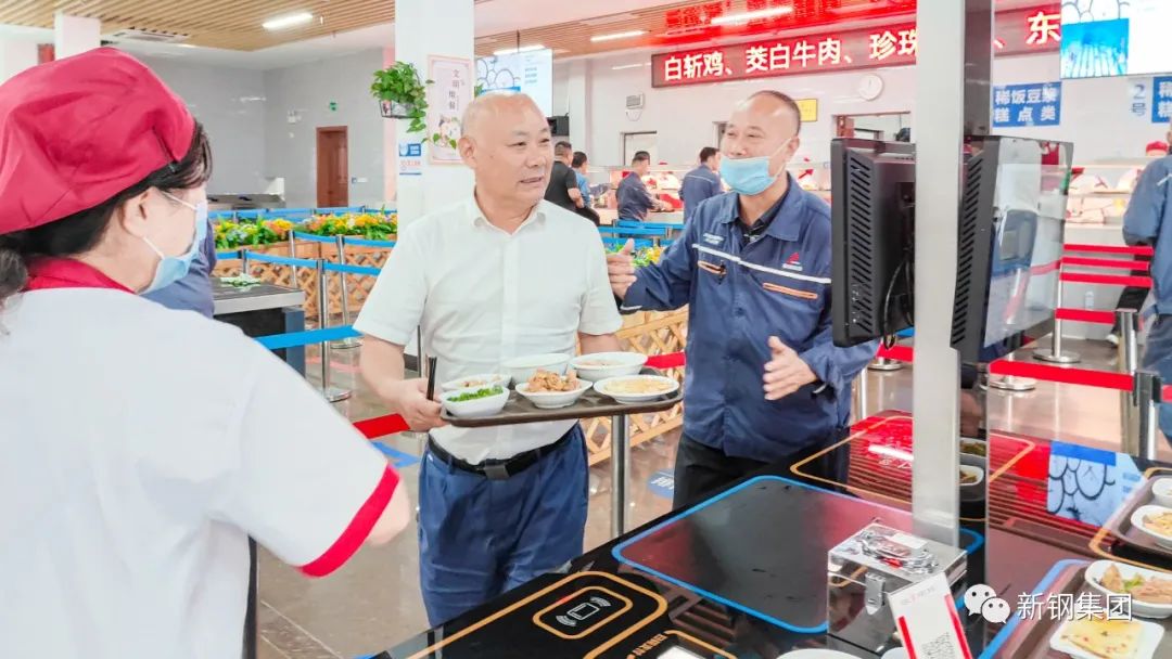 新钢集团党委书记、董事长刘建荣与职工一道排队选餐用餐,与一线职工话家常、聊工作,询问他们对公司餐饮、洗浴、住宿、观影福利等方面的评价和意见。