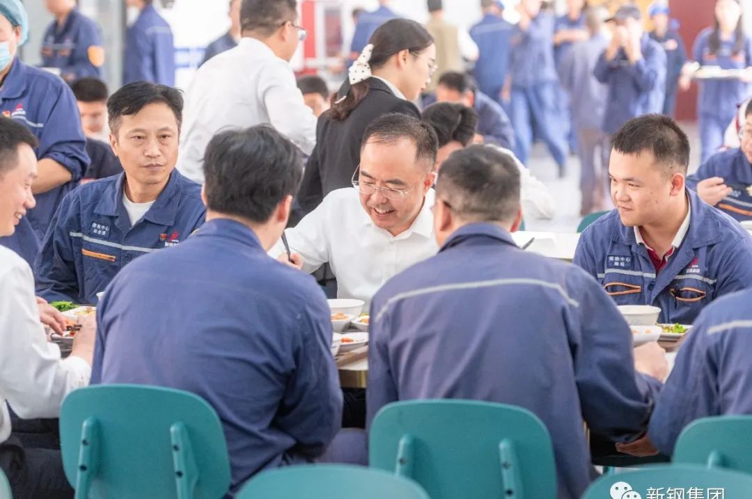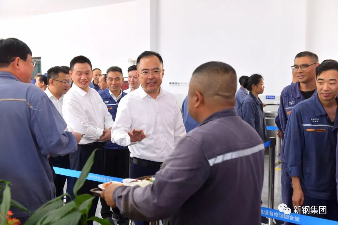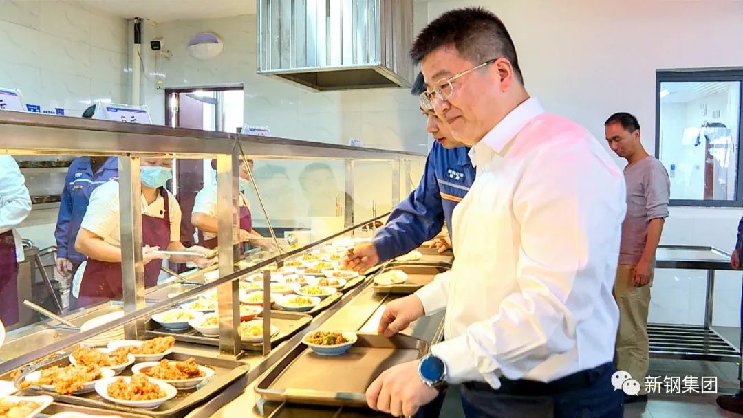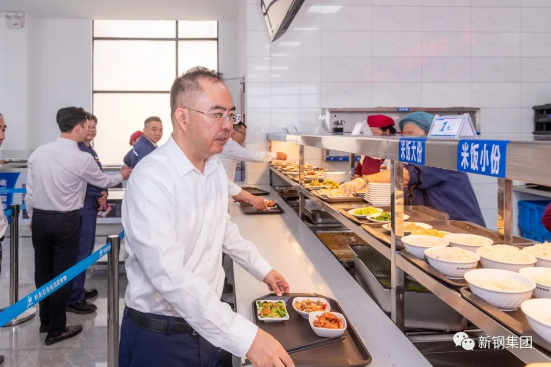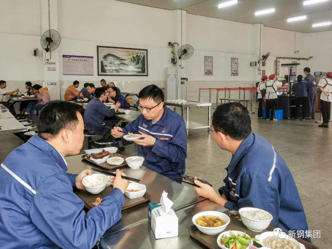 新钢集团党委书记、董事长刘建荣与职工一道排队选餐用餐,与一线职工话家常、聊工作,询问他们对公司餐饮、洗浴、住宿、观影福利等方面的评价和意见。