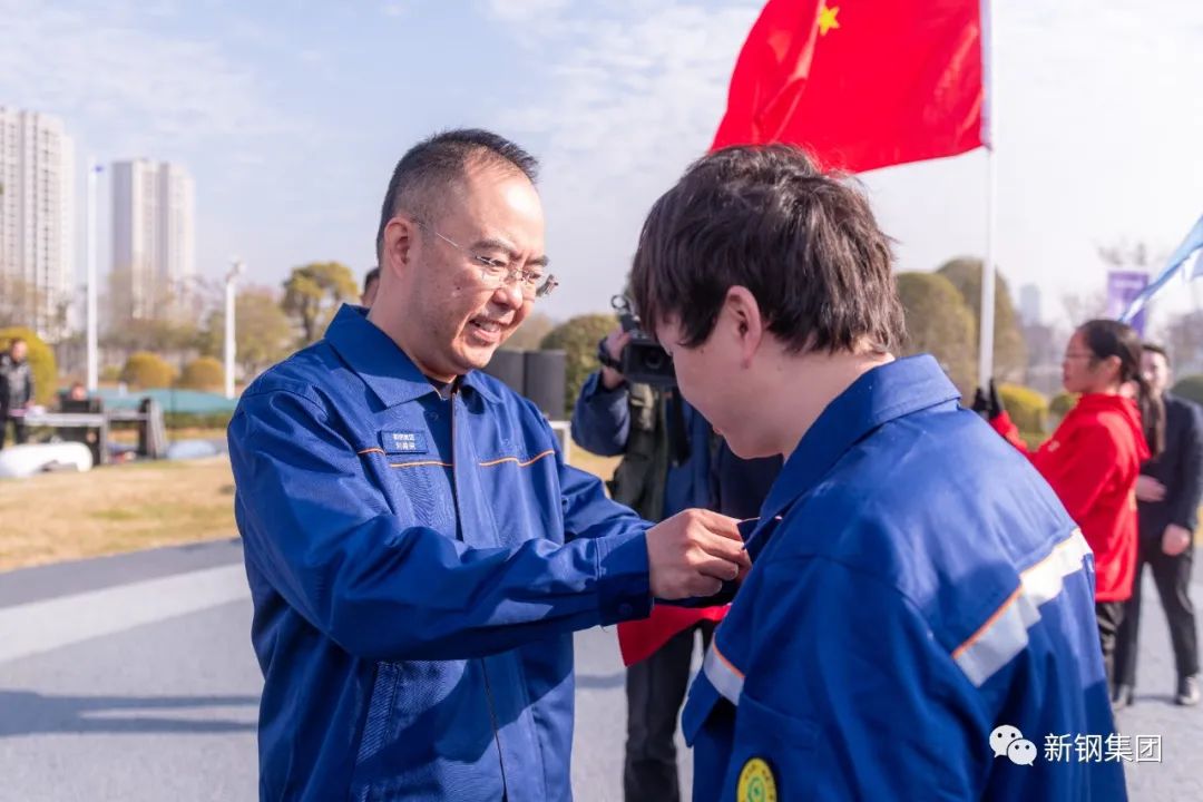 伴随着嘹亮的宝武司歌《我战斗在金色的炉台上》响起,身穿“宝武蓝”新工装的干部职工代表精神饱满站立在换装仪式现场,公司党委书记、董事长刘建荣率领导班子为干部职工代表一一佩戴宝武新工装姓名牌。